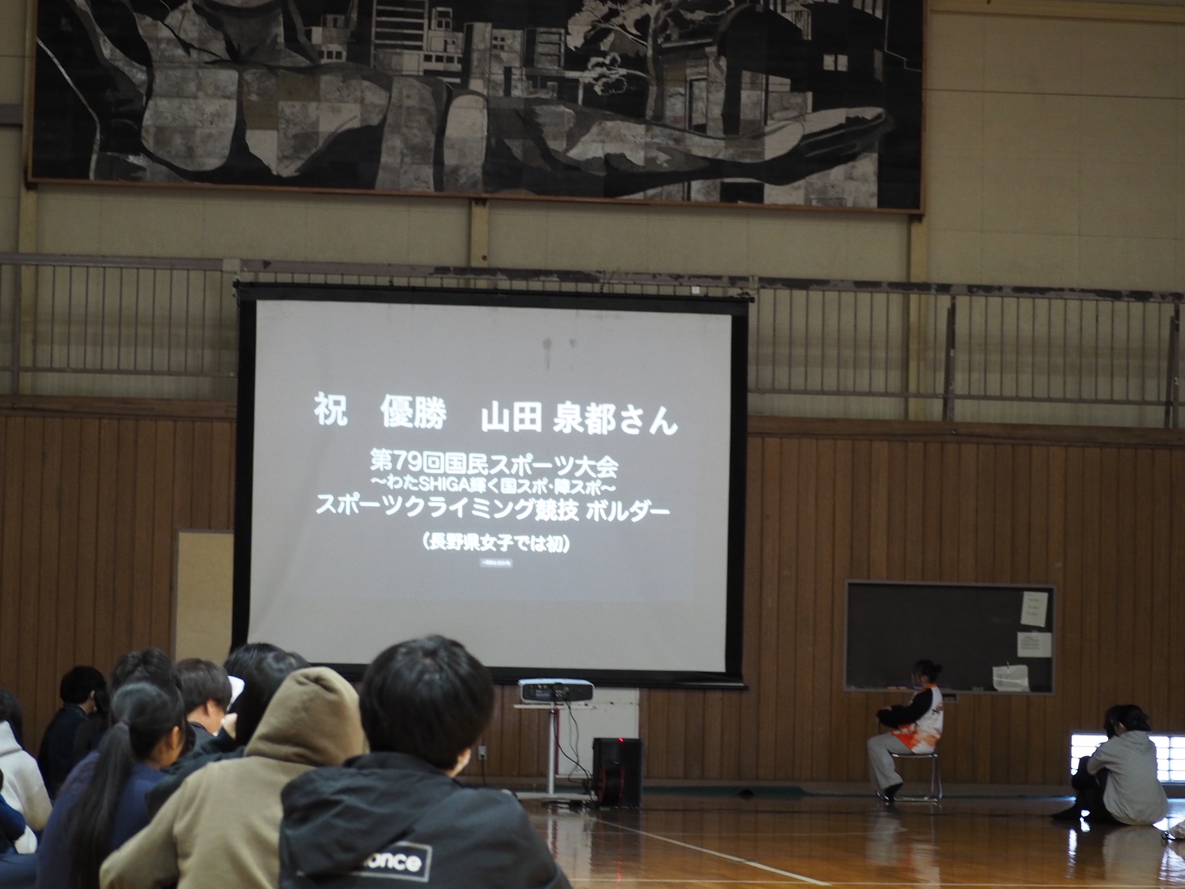 そして、国スポスポーツクライミングで全国優勝を果たした山田さんの報告会が行われました。大会の様子を映像で見ることができ、改めて凄さを実感できました。