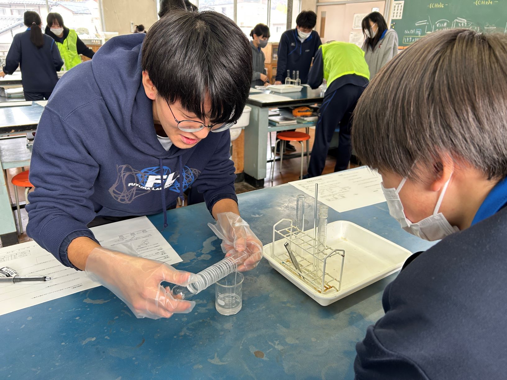 3年生の実験は、これで終了です。もしかしたら、人生最後の理科実験になった生徒もいるかも知れません。実験を通して、課題発見能力・課題解決能力・コミュニケーション能力等が身に着いたのではないかと期待しています。3年生はこれから本格的な受験シーズンに入ります。自分の力を信じて、かんばれ!!応援しています!!!